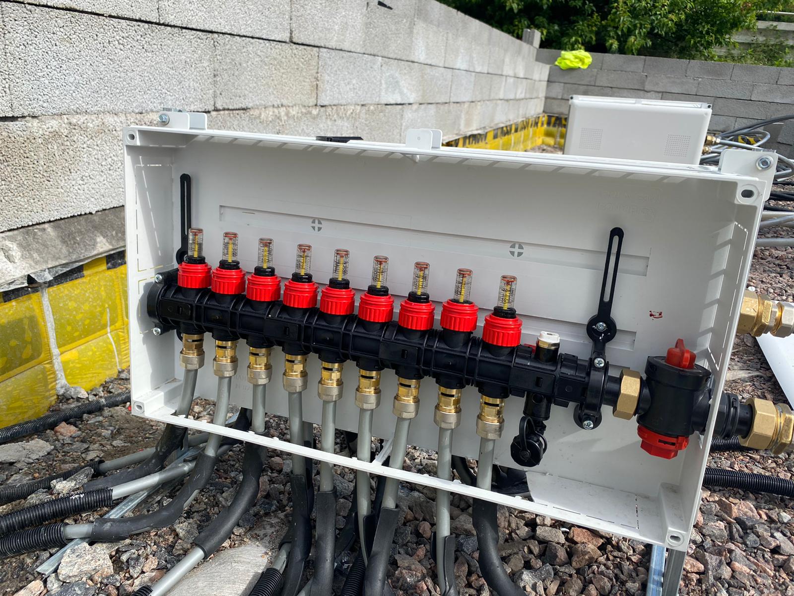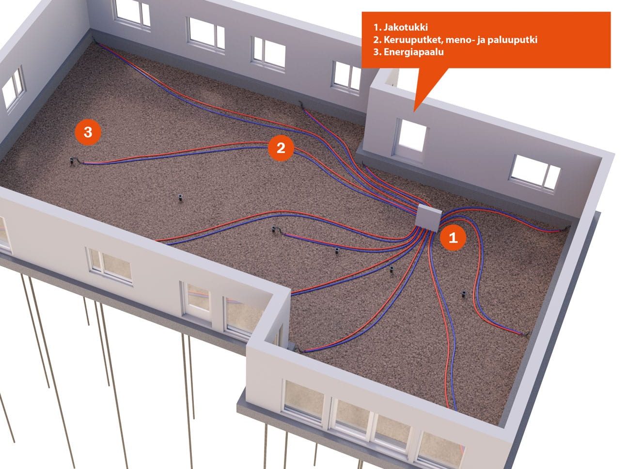 Jakotukit sijoitetaan alapohjaan tai rakennuksen sisälle. Näiltä jakotukeilta vedetään syöttölinjat lämmönjakohuoneeseen, jotka kytketään maalämpöpumppuun.