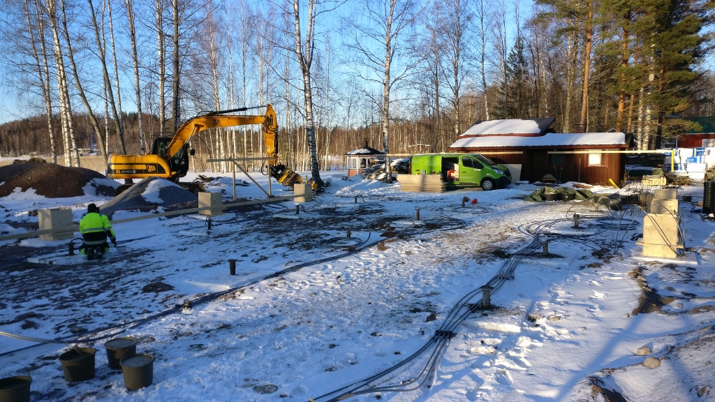Huhtikuussa 2018 aloitimme energiapaalukentän asentamisen Hollolan kirkonkylällä. Aktivoitavat paalut olivat peräti 50 metriä syviä. Energiapaaluja aktivoitiin yhteensä 425 metriä. Yksittäisiä paaluja muutettiin energiapaaluiksi 17 ja niistä tullaan saamaan peräti 9 kilowattia lämmitysenergiaa. Asensimme kohteeseen myös lattialämmitysen, sekä lattiaviilennysen laitteiston. Suoritimme myös maalämpöpumpun asennustyöt.